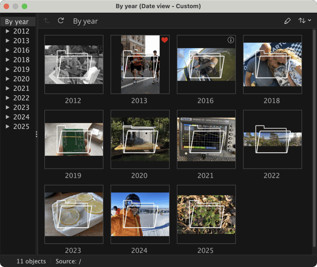 Pouvoir trouver rapidement des images d'intérêt dans une galerie immense est un grand avantage pour les visiteurs, nous avons donc décidé de vous l'apporter également : les vues peuvent maintenant être explorées depuis jAlbum aussi. Il suffit de double-cliquer sur une vue pour l'explorer. L'explorateur de vues présente des similitudes avec l'explorateur principal de jAlbum (ou tout explorateur de fichiers, d'ailleurs) : vous trouverez l'arbre de dossiers bien connu à gauche (si la vue contient des dossiers, bien sûr). Vous avez votre contenu sous forme de vignettes dans une grille et une barre d'outils :
