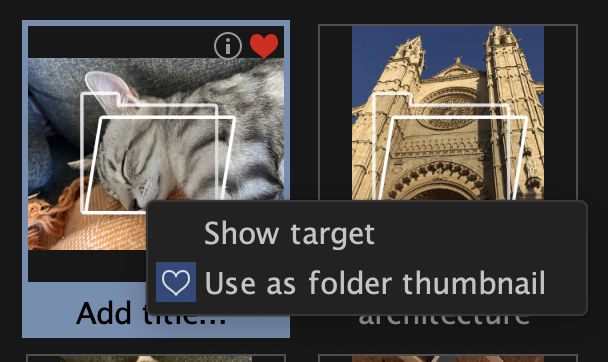 Les utilisateurs ont exprimé le souhait de pouvoir désigner une image de leur choix pour représenter une vue, ou un dossier à l'intérieur. Vous pouvez désormais le faire aussi en cliquant simplement avec le bouton droit sur une miniature et en sélectionnant « Utiliser comme miniature de dossier ». Cliquez sur le bouton « actualiser » si vous ne voyez pas le changement immédiatement.